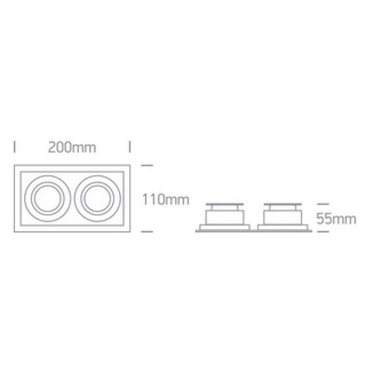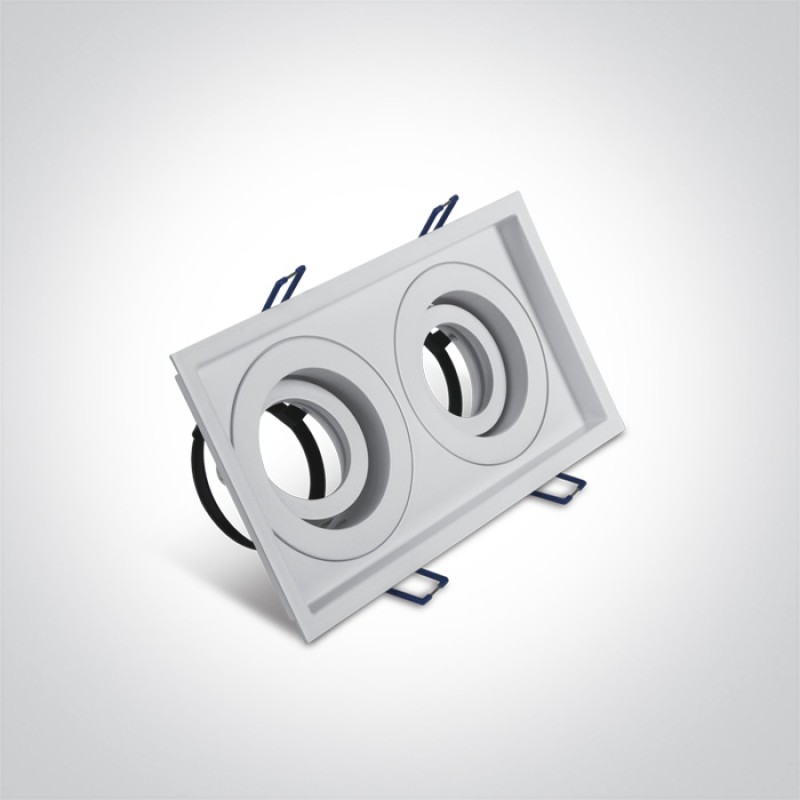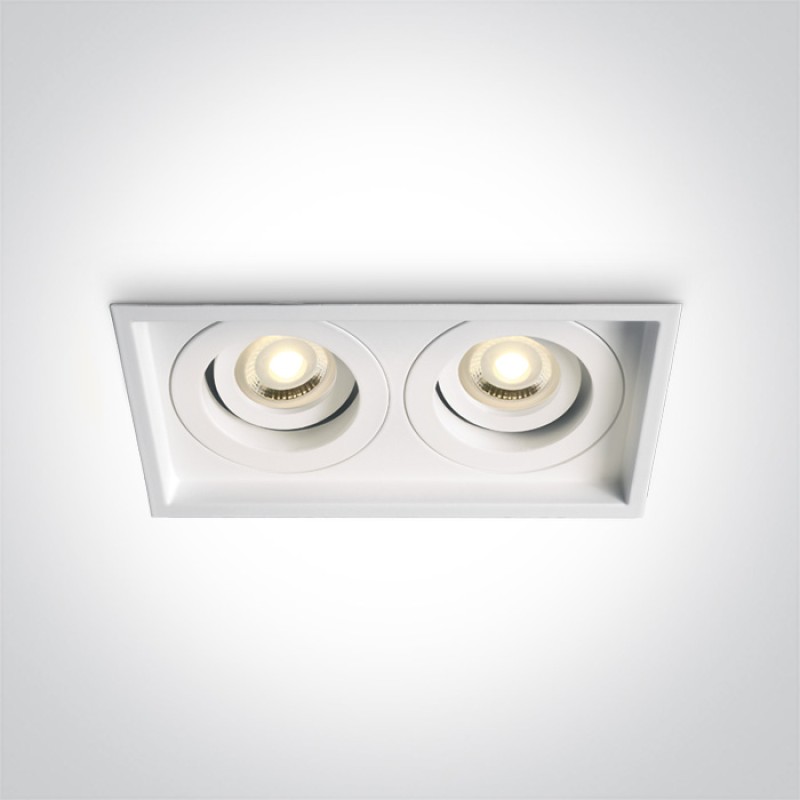 Spot incastrat cu rama patrata, cu 2 spoturi orientabile, pentru 2 becuri cu LED GU10. Are rama subtire interioara, de culoare alba, in care se monteaza becul. Placa suport pentru spoturi este putin adanca, pentru a ascunde volumul spoturilor orientate din planul tavanului.Se poate utiliza in spatii interioare comerciale, de retail, medicale. Se monteaza usor, si becul se schimba prin fata, simplu fara demontarea lui.