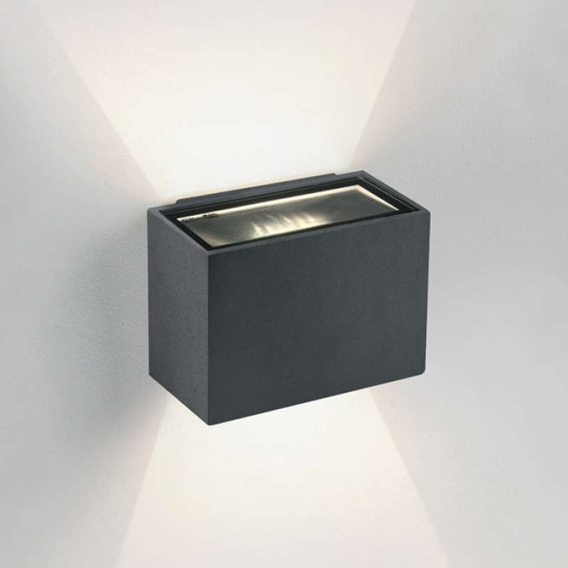 Aplica de exterior LED modernă, destinată iluminării faţadelor, teraselor sau intrărilor – proiectează lumina elegant în sus şi în jos (efect up-down), punând în valoare arhitectura spaţiilor exterioare.