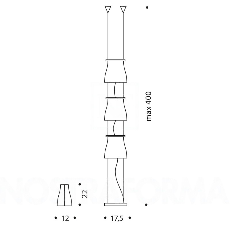 Lampadar compus din 3 abajur-uri din sticla de Murano, alb satinat, in trei straturi pentru o dispersie perfecta a luminii, inaltime maxima de 4m lungime cu prindere in tavan si fixare cu greutate suspendata jos, alimentare cu variator la priza 230v. Prinderea de tavan se face independent de alimentare, ceea ce ne permite optiuni de aranjare a celor 3 lampi pe verticala in limita cablului de legatura intre ele.