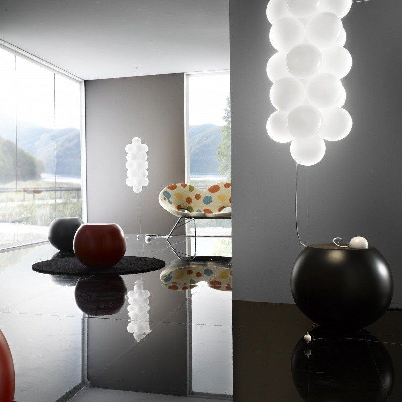 Acesta este un lampadar deosebit alcatuit din 20 de bile luminoase realizate manual din sticla murano satinata, care par sa pluteasca in camera. O structura metalica lacuita alb, solida, sustine lampa in 2 puncte, din tavan si cu prindere pe podea. Se alimenteaza la priza si lumina se poate dima de la picior.