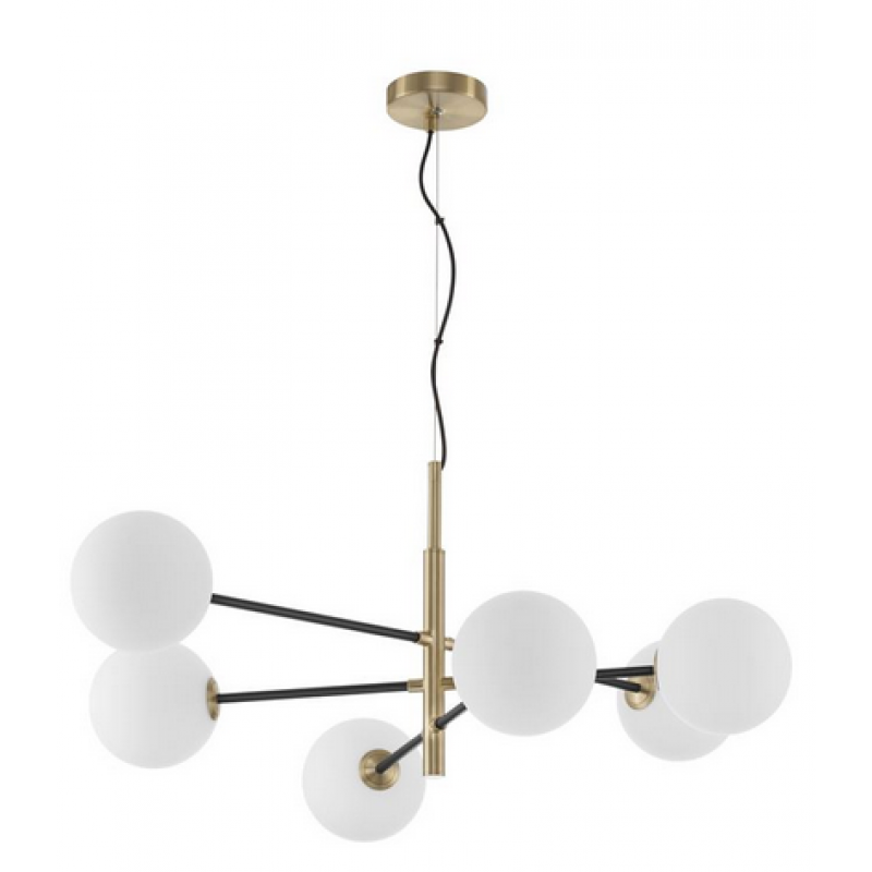 Lustra cu 6 globuri din sticla opal si brate de culoare neagra si decoratie auriu mat, rozeta conexiune electrica de aceeasi culoare, cu cablu de suspendare maxim 136cm. Lampa se preteaza in spatiile rezidentiale.