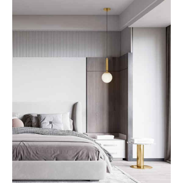 Pendul cu glob alb matt, suspendat cu cablu 185cm, si dulie pentru bec E27 inclusa, culoare brass-gold. Se recomanda in spatii de locuit.