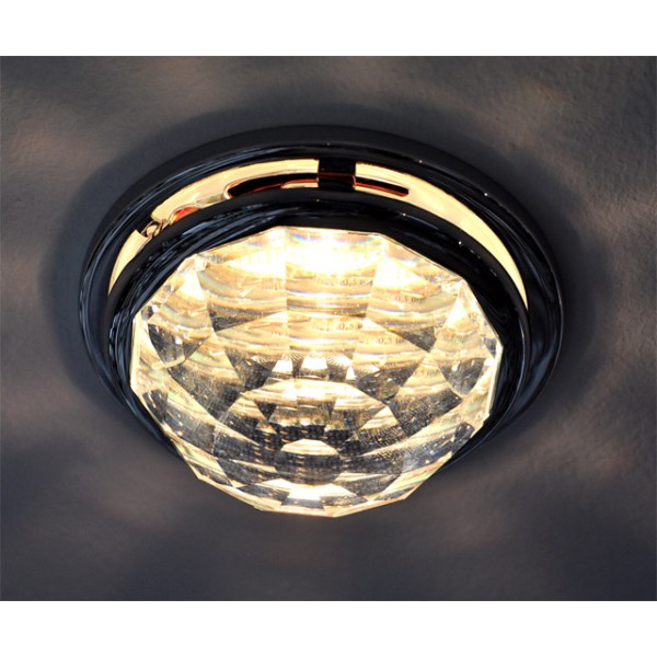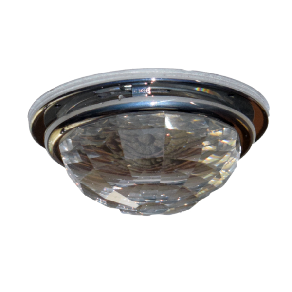 Un spot incastrat din metal crom lucios si un cristal Swarovski sub forma de cupola fatetata de culoare transparenta cu reflexie argintie. Acesta reflecta lumina pe tavan, datorita fatetelor argintii ale cristalului.